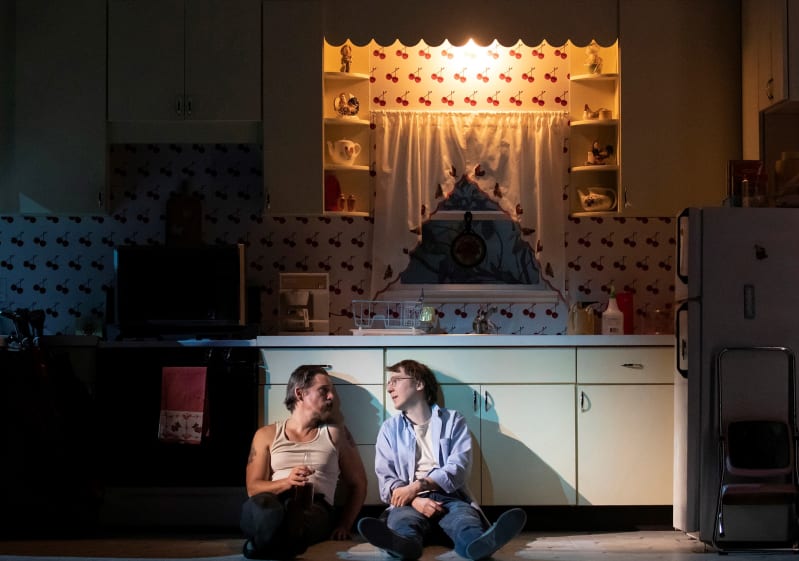 When I first read the play, I felt that the house was a battleground and that, though we probably wanted to be in a room with all the trappings of a kitchen, the volume of space needed to be tweaked in some way to achieve that. I ended up making the house very shallow and pretty much bisected down the middle, so there is a sense of the two sides sparring. There are also a lot of binaries in the play – wildness/domesticity, success/failure, male/female, so this bifurcation of space felt right. I wanted to create a space that has a sense of menace within an atmosphere of domesticity. One of the reference points I landed on was the work of David Lynch, who really excels at creating that very subtle sense of menace in an otherwise rather ordinary-feeling room. There is a carefully calibrated level of stylization which subconsciously gives an uncanny feeling to the environments. The director, James Macdonald, and I decided that we wouldn’t hew to a particular time period but that the props and stuff of this world would be archetypal. The visual and tangible world of the play is a combination of old school Hollywood, the myth of the American West, and the memory of your mom’s house. I researched log cabins, 1950s kitchens, and deserts. My way into the design was through this particular green 1970s sculptured carpet that I found one day, a crazy cherry wallpaper, and a visit I made a few years ago to Marfa, Texas, which is probably the most remote place I’ve ever been.