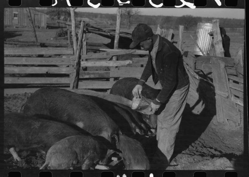 A farmer’s son feeds pigs in Creek County, Oklahoma, in 1940. Photo by Lee Russell.