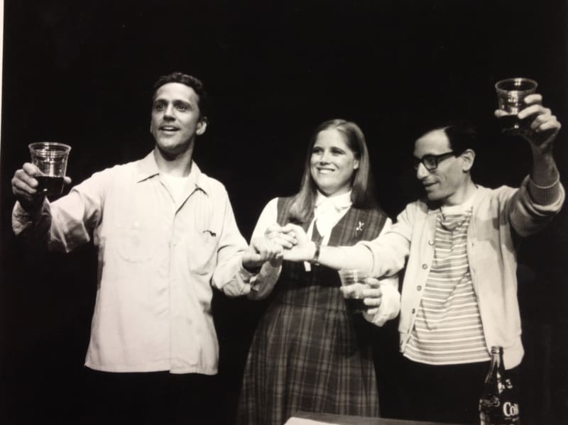 Far from the pressures and scrutiny of Broadway, La Jolla Playhouse served as a safe harbor for Sondheim and Furth to return to Merrily after its initial Broadway failure and make the first of many attempts to make the show succeed. Directed by James Lapine, the production ran for 24 performances and featured Chip Zien, Heather MacRae, and John Rubinstein as Charley, Mary, and Frank. Furth streamlined the book, and Sondheim added and restored songs in this version (including “Growing Up” and “It’s a Hit”), while cutting others. Sylvie Drake of the LA Times still found it “lumbering” but felt there was enough good in the show to merit the attempt: “one must hope that the work can and will continue.”