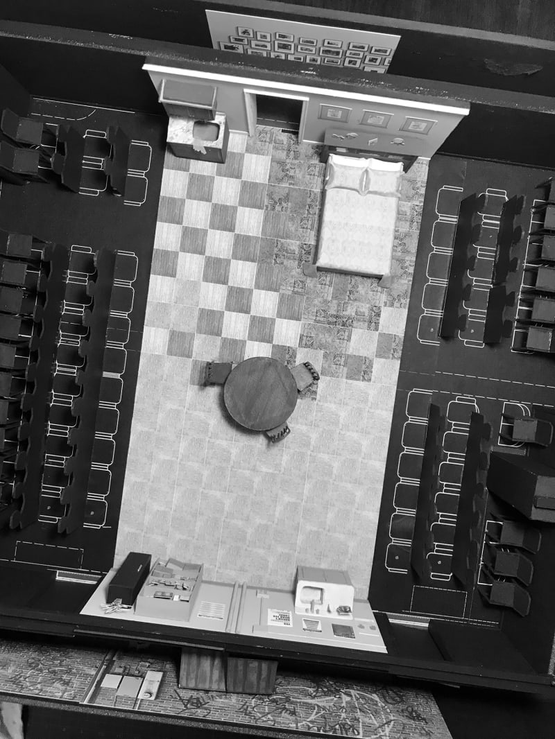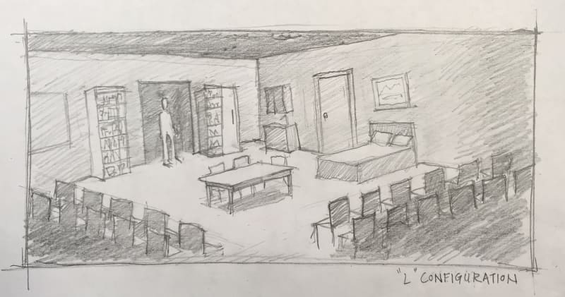 “Next we discussed an ‘L’ configuration, with audience on two sides and two scenic walls to represent the home and the center. This had an interesting dynamic: each side of the audience faces a different part of the set. As the settings alternate, audiences keep shifting their relationship to the space. The problem was that the far corner felt very far away, and we couldn’t land on a good place for the alley-dumpster.”